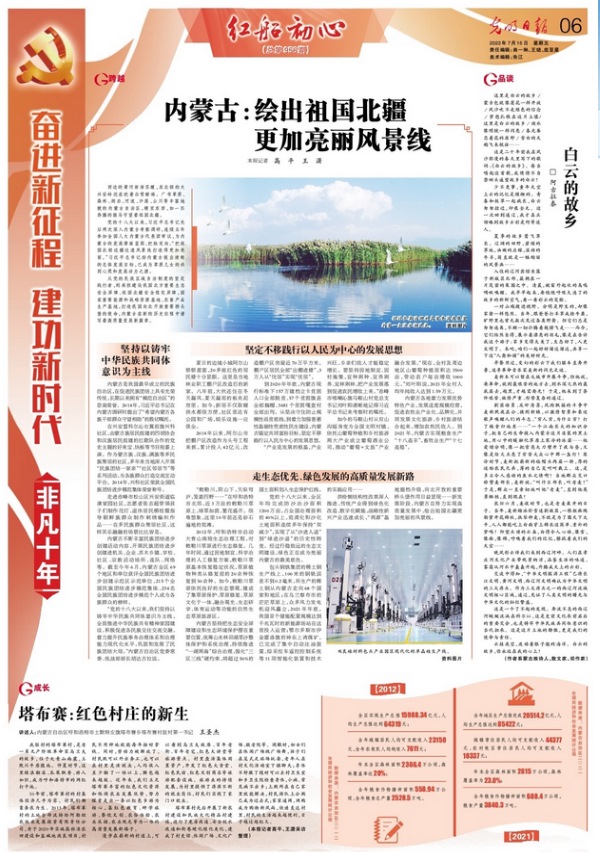 7月15日,《光明日報》6版刊發(fā)《奮進新征程建功新時代·非凡十年|內(nèi)蒙古:繪出祖國北疆更加亮麗風景線》,全文如下: