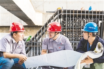 韓佳彤(中)在施工現(xiàn)場為團(tuán)隊(duì)人員指導(dǎo)工作。