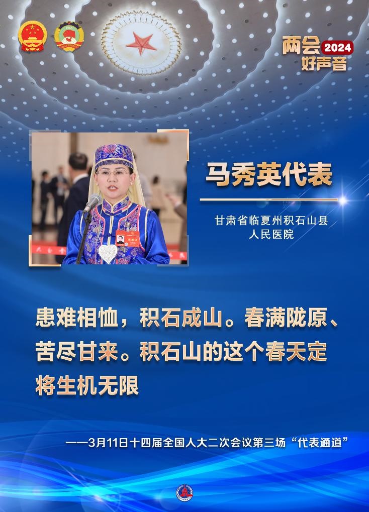 11日下午,十四屆全國人大二次會議第三場“代表通道”在人民大會堂中央大廳北側舉行。扎根基層、微光如炬,6位全國人大代表分享一線故事,一句句真摯的話語,凝聚成奮進的旋律,在春日里回響。