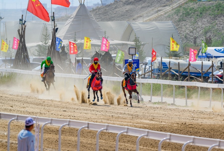 7月13日下午,內(nèi)蒙古錫林浩特馬都核心區(qū)賽馬場,錫林浩特蒙古馬積分賽1000米速度賽和15公里接力賽正在這里輪番進(jìn)行,比賽現(xiàn)場,選手們策馬奔騰,激戰(zhàn)正酣。