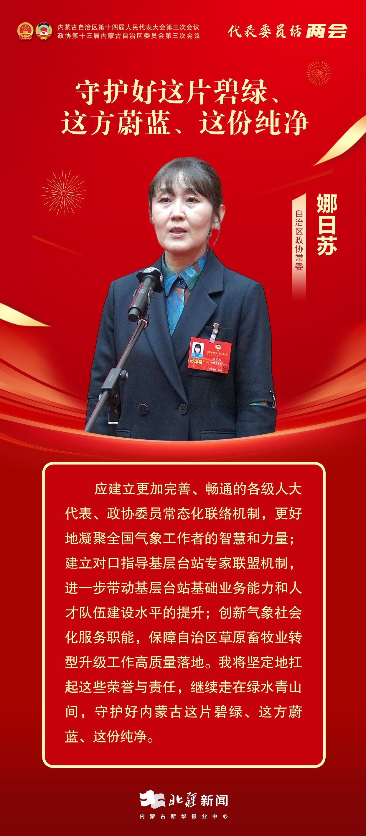 深耕生態(tài)氣象和牧業(yè)氣象服務(wù)多年,讓娜日蘇有了更加深入的思考,她建議:應(yīng)建立更加完善、暢通的各級人大代表、政協(xié)委員常態(tài)化聯(lián)絡(luò)機(jī)制,從而更好地凝聚全國氣象工作者的智慧和力量;建立對口指導(dǎo)基層臺站專家聯(lián)盟機(jī)制,進(jìn)一步帶動基層臺站基礎(chǔ)業(yè)務(wù)能力和人才隊伍建設(shè)水平的提升;創(chuàng)新氣象社會化服務(wù)職能,保障自治區(qū)草原畜牧業(yè)轉(zhuǎn)型升級工作高質(zhì)量落地。
