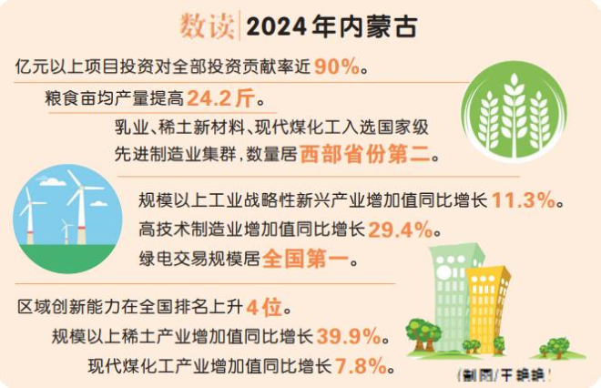 新賽道上,隨著高質量重大項目加速落地,巴彥淖爾市等地現代農牧業(yè)發(fā)展風生水起,呼和浩特市加速由“中國乳都”向“世界乳都”邁進,“世界綠色硅都”包頭市建設“兩個稀土基地”步履鏗鏘,我區(qū)第一經濟大市鄂爾多斯市向國家現代煤化工示范區(qū)發(fā)起沖刺,全區(qū)各地勇往直前推動傳統(tǒng)產業(yè)“脫胎換骨”。2024年,全區(qū)建設高標準農田940萬畝、“噸糧田”855萬畝,糧食畝均產量提高24.2斤;自治區(qū)乳業(yè)、稀土新材料、現代煤化工入選國家級先進制造業(yè)集群,數量居西部省份第二;全區(qū)規(guī)模以上稀土產業(yè)增加值同比增長39.9%,現代煤化工產業(yè)增加值同比增長7.8%……內蒙古傳統(tǒng)產業(yè)轉型升級厚積薄發(fā)!