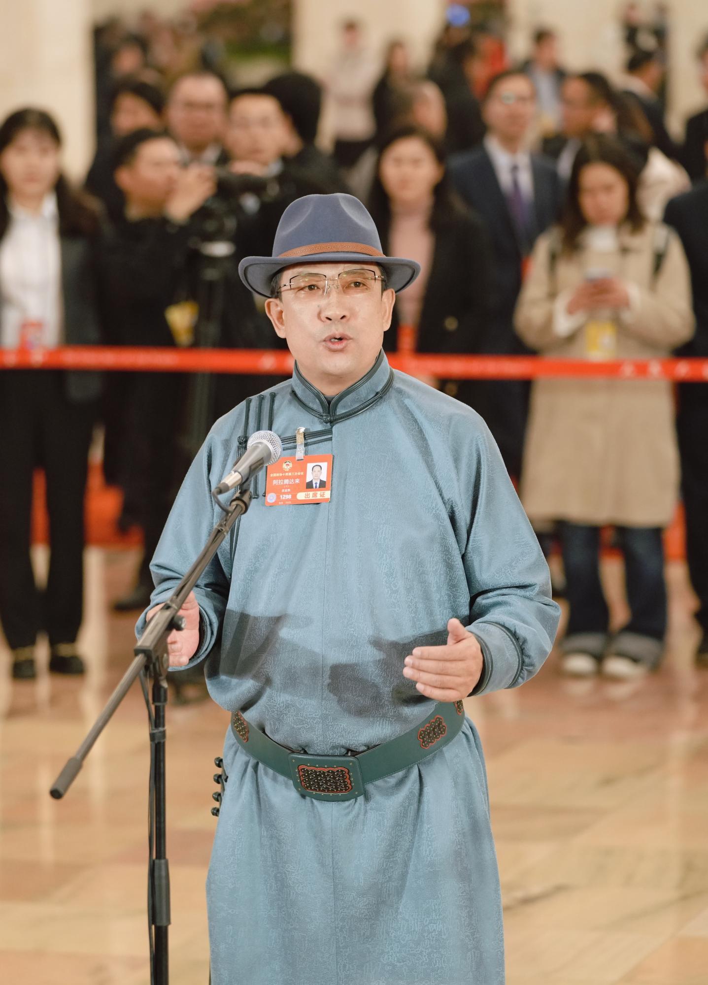3月10日,全國(guó)政協(xié)十四屆三次會(huì)議第三場(chǎng)“委員通道”集體采訪活動(dòng)在北京人民大會(huì)堂舉行。住內(nèi)蒙古全國(guó)政協(xié)委員阿拉騰達(dá)來(lái)接受媒體采訪。草原云記者 王鵬 攝
