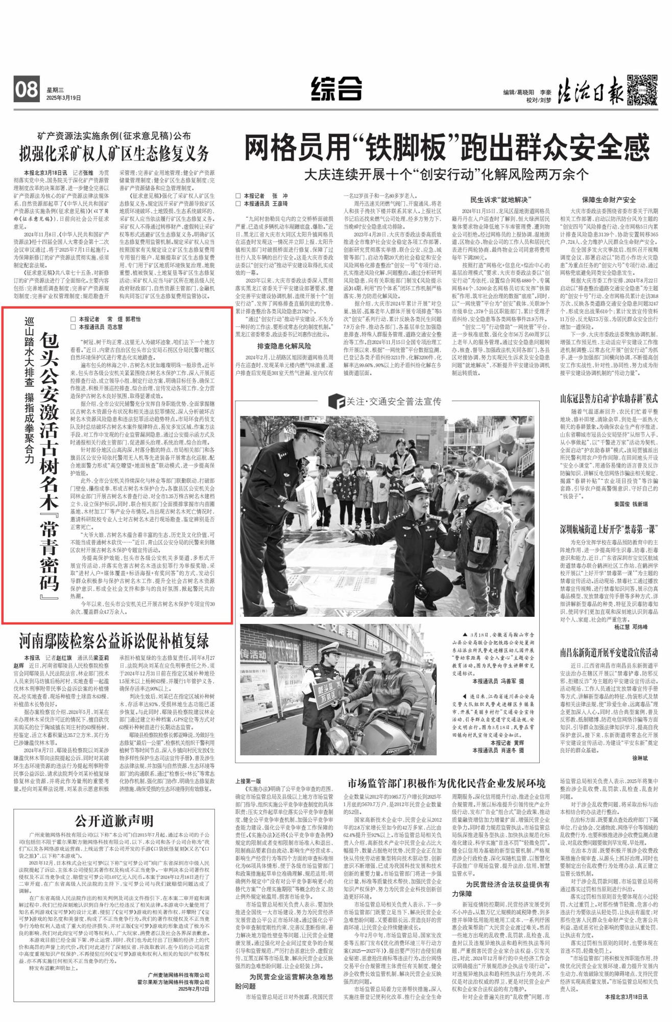 2025年3月19日,《法治日報(bào)》第8版刊發(fā)題為《巡山踏水大排查 攥指成拳聚合力 包頭公安激活古樹名木“常青密碼”》的文章,報(bào)道了近年來,包頭市各級公安機(jī)關(guān)緊緊圍繞古樹名木保護(hù)工作,深入開展巡控排查行動,成立領(lǐng)導(dǎo)小組、制定行動方案、明確目標(biāo)任務(wù)、確保工作推進(jìn),積極開展巡控排查、綜合治理、宣傳發(fā)動各項(xiàng)工作,全力營造保護(hù)古樹名木良好氛圍,取得顯著成效。