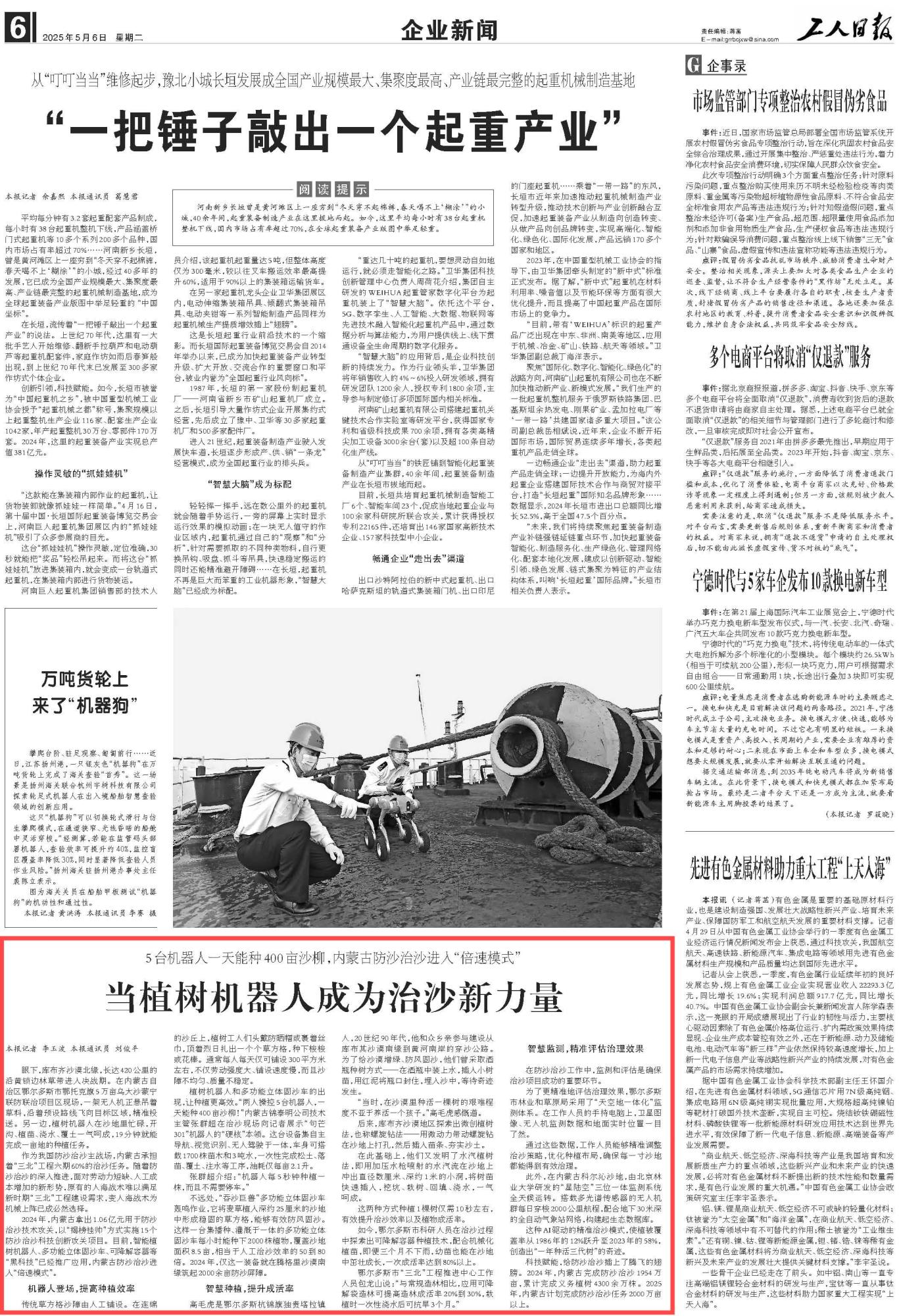 2025年5月6日,《工人日報》第6版刊發(fā)題為《當植樹機器人成為治沙新力量》的文章,報道了內蒙古作為我國防沙治沙主戰(zhàn)場,承擔著“三北”工程六期60%的治沙任務。隨著防沙治沙的深入推進,智能植樹機器人、多功能立體固沙車、可降解容器等“黑科技”已經(jīng)推廣應用,內蒙古防沙治沙進入“倍速模式”。