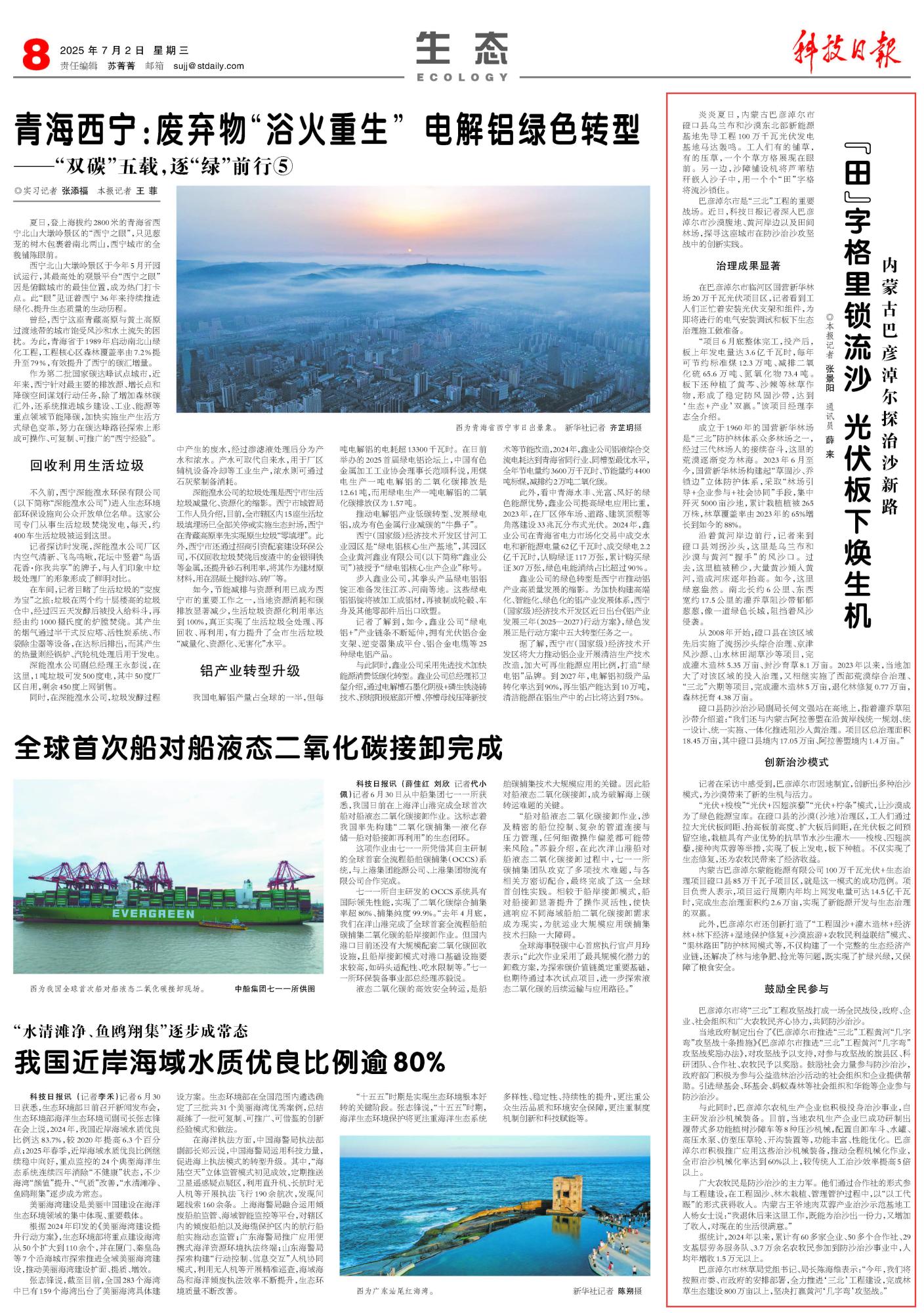 2025年7月2日《科技日報》第8版刊發(fā)了《內(nèi)蒙古巴彥淖爾探治沙新路“田”字格里鎖流沙 光伏板下煥生機》的文章,報道了內(nèi)蒙古巴彥淖爾市將“三北”工程攻堅戰(zhàn)打成一場全民戰(zhàn)役,政府、企業(yè)、社會組織和廣大農(nóng)牧民齊心協(xié)力,共同防沙治沙。因地制宜,創(chuàng)新出多種治沙模式,為沙漠帶來了新的生機與活力。