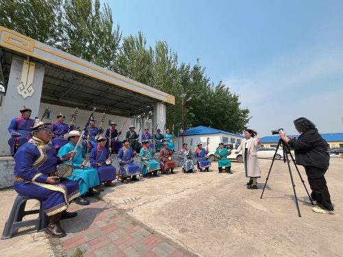 5月21日,記者走進(jìn)吐列毛杜鎮(zhèn)鐵特格嘎查,恰巧遇到鎮(zhèn)黨委宣傳委員高薩日娜正在拍攝最新一期的《村聞聯(lián)播》。嘎查小舞臺(tái)上,17名村民身著蒙古族服飾,手持四胡演奏著《烏力格爾三部曲》《牧民歌唱共產(chǎn)黨》等悠揚(yáng)的樂(lè)曲。他們大部分年齡都在五六十歲,來(lái)自當(dāng)?shù)氐睦ざ祭渌暮鷧f(xié)會(huì)。該協(xié)會(huì)共有60余名會(huì)員,多年來(lái)以四胡彈奏、科爾沁民歌、烏力格爾(一種蒙古族的曲藝說(shuō)書(shū)形式)、好來(lái)寶說(shuō)唱等各種方式,參與著吐列毛杜鎮(zhèn)文化志愿服務(wù)。