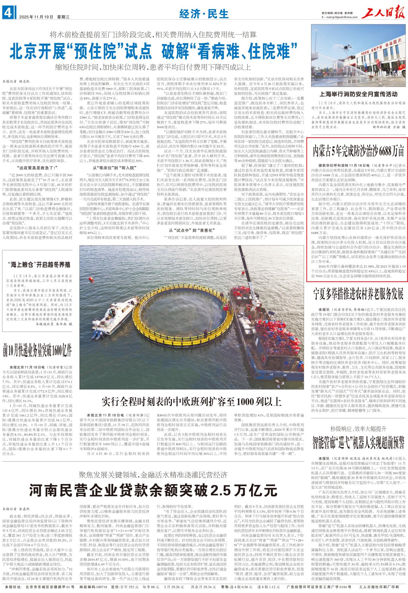 2025年11月19日,《工人日報》第4版刊發(fā)題為《內蒙古5年完成防沙治沙6688萬畝》的文章,報道了在最近5年間,內蒙古累計完成防沙治沙6688萬畝,占全國治理面積的40%以上,進一步筑牢我國北方重要生態(tài)安全屏障。