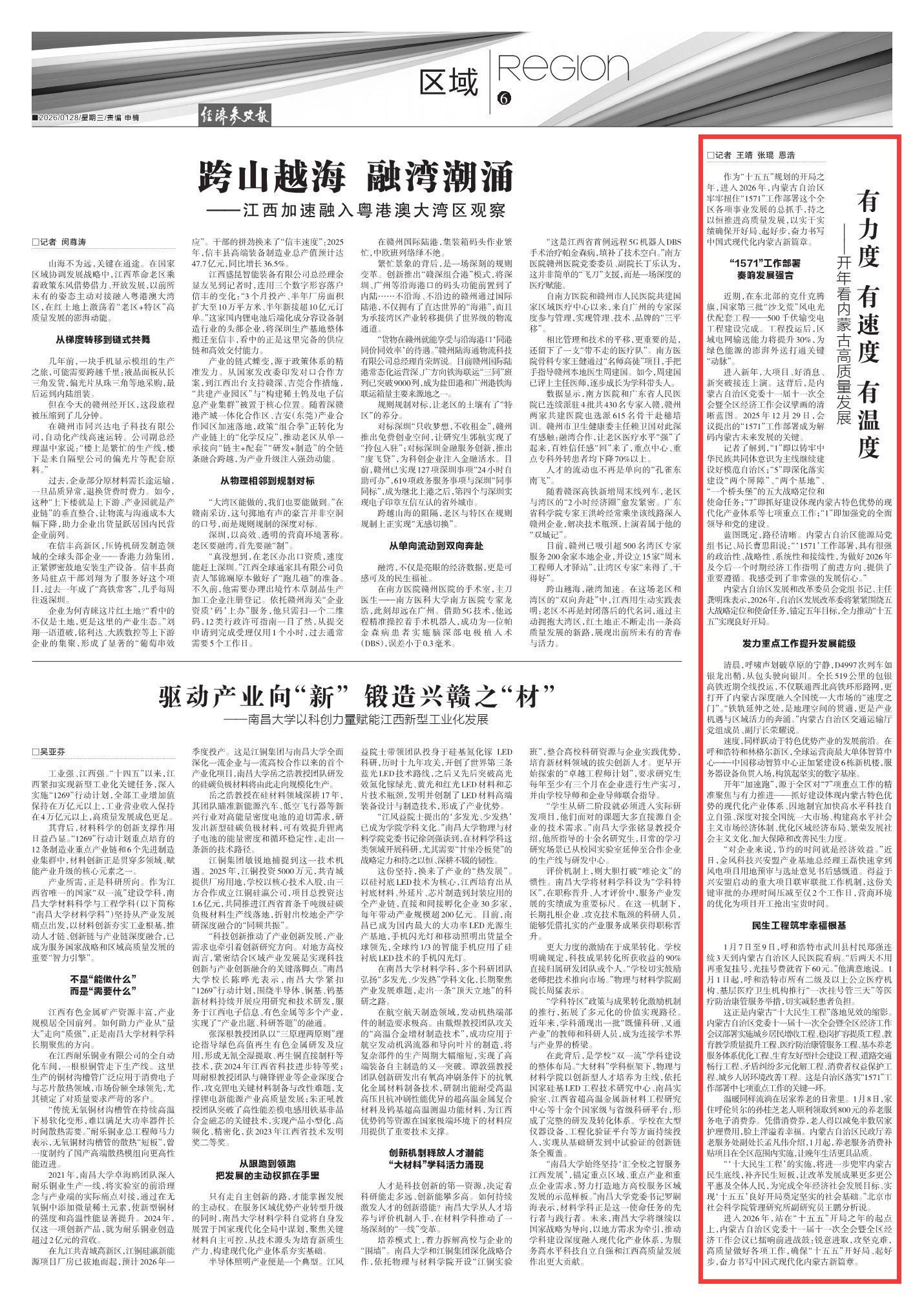 2026年1月28日《經(jīng)濟(jì)參考報(bào)》第6版刊發(fā)了《有力度 有速度 有溫度——開年看內(nèi)蒙古高質(zhì)量發(fā)展》的文章,報(bào)道了進(jìn)入2026年,站在“十五五”開局之年的起點(diǎn)上,內(nèi)蒙古自治區(qū)黨委十一屆十一次全會(huì)暨全區(qū)經(jīng)濟(jì)工作會(huì)議已擂響前進(jìn)戰(zhàn)鼓:銳意進(jìn)取,攻堅(jiān)克難,高質(zhì)量做好各項(xiàng)工作,確?!笆逦濉遍_好局、起好步,奮力書寫中國式現(xiàn)代化內(nèi)蒙古新篇章。