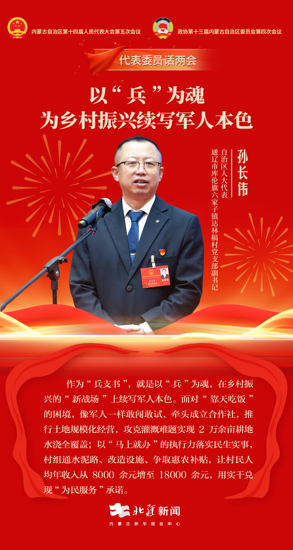 北疆新聞呼和浩特2月5日消息(記者 楊凈毓 李文華 張鑫) “作為‘兵支書’,就是要以‘兵’為魂,在鄉(xiāng)村振興‘新戰(zhàn)場’上續(xù)寫軍人本色,破解發(fā)展難題、帶動鄉(xiāng)親增收?!?月4日,內蒙古自治區(qū)第十四屆人民代表大會第五次會議“代表通道”上,自治區(qū)人大代表、通遼市庫倫旗六家子鎮(zhèn)達林稿村黨支部副書記孫長偉,分享了自己作為“兵支書”,帶領村民壯大集體經(jīng)濟、實現(xiàn)村莊蝶變的實踐經(jīng)驗與未來期盼。
