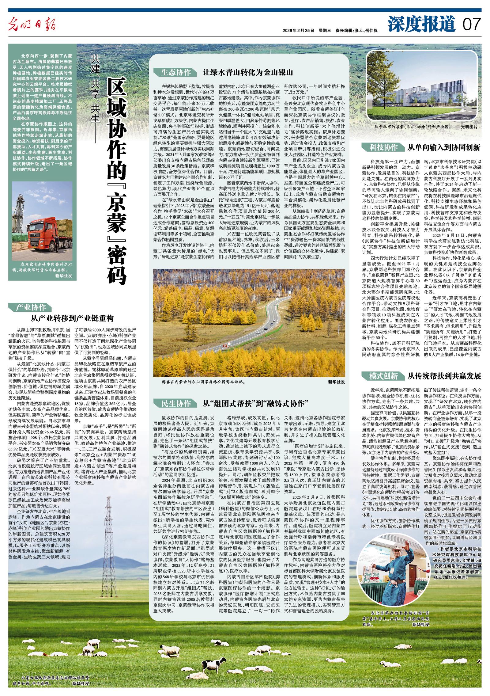 2026年2月25日《光明日報(bào)》第7版整版刊發(fā)了《共建、共享、共生——區(qū)域協(xié)作的“京蒙”密碼》的文章,報(bào)道了聚焦民生福祉,夯實(shí)協(xié)作根基。京蒙協(xié)作始終將保障和改善民生作為出發(fā)點(diǎn)和落腳點(diǎn),通過精準(zhǔn)對接群眾需求,推動優(yōu)質(zhì)資源對接、共享,努力提升人民的幸福感、獲得感,通過改善民生凝聚人心。