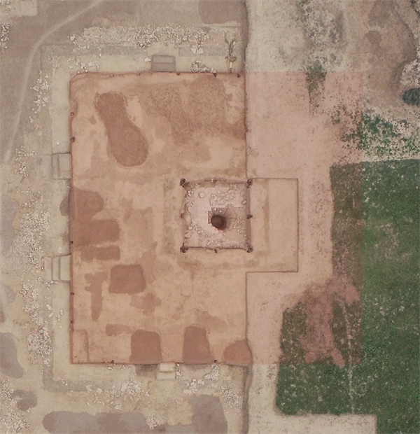 已發(fā)掘部分主要由中部方形夯土臺(tái)基、土臺(tái)四邊正對(duì)的四組附屬建筑以及四角曲尺形附屬建筑組成,各方向?qū)?yīng)位置的建筑,平面及柱網(wǎng)布局一致。中部夯土臺(tái)基邊長約為27.8米,土臺(tái)中心有一邊長為6.5米的方形半地穴空間,土臺(tái)四邊各連接兩處踏道,有柱洞緊靠臺(tái)緣,四周環(huán)繞散水。中心夯土臺(tái)四面中部分別對(duì)應(yīng)四組附屬建筑,現(xiàn)存相對(duì)的兩個(gè)近方形夯土臺(tái),土臺(tái)邊緣環(huán)繞柱洞和柱礎(chǔ)石,二者共同被一圈散水包圍。中心夯土臺(tái)四角分布曲尺形夯土臺(tái)基,同樣由散水包圍,臺(tái)基邊緣環(huán)繞柱洞及柱礎(chǔ)石,臺(tái)基上散布零星的柱礎(chǔ)石。附屬建筑以夯土墻相連,并分隔出多個(gè)院落將中心土臺(tái)圍合。出土遺物主要以建筑用材為主,包括云紋瓦當(dāng)、繩紋瓦件、回紋地磚、空心磚、陶水管等。