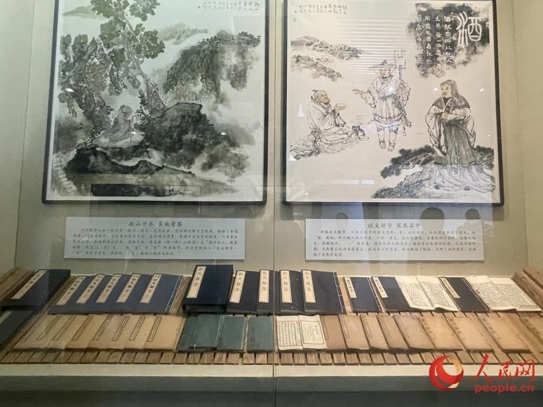 許慎文化園東配殿叔重堂內(nèi)陳列的資料及壁畫(huà)。人民網(wǎng)記者 劉微攝