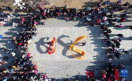 2月21日,在天津市水上公園,民間藝人表演空竹舞龍(無(wú)人機(jī)照片)。