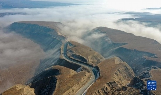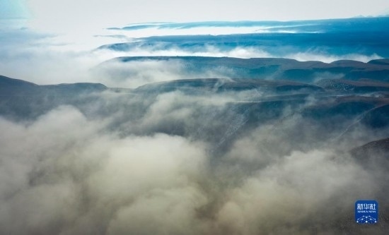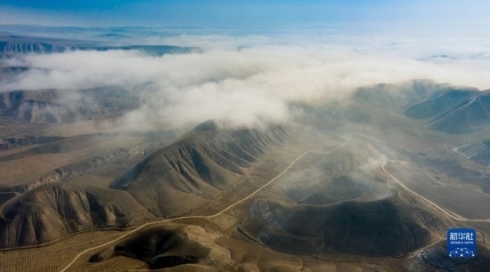 當日,寧夏吳忠市同心縣的山谷間出現(xiàn)云海景觀,農田、旱塬、公路在霧中若隱若現(xiàn),景色壯美。