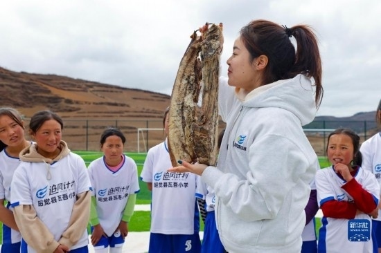 圖為四川籍的中國女足國腳萬佳瑤(前)獲贈(zèng)瓦吾小學(xué)女足球隊(duì)員從家里帶來的臘肉(2023年3月3日攝)。