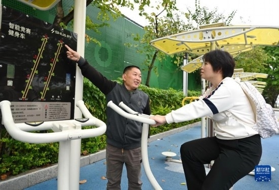 4月24日,市民在福州市鼓樓區(qū)西河智慧體育公園使用智能競賽健身車。