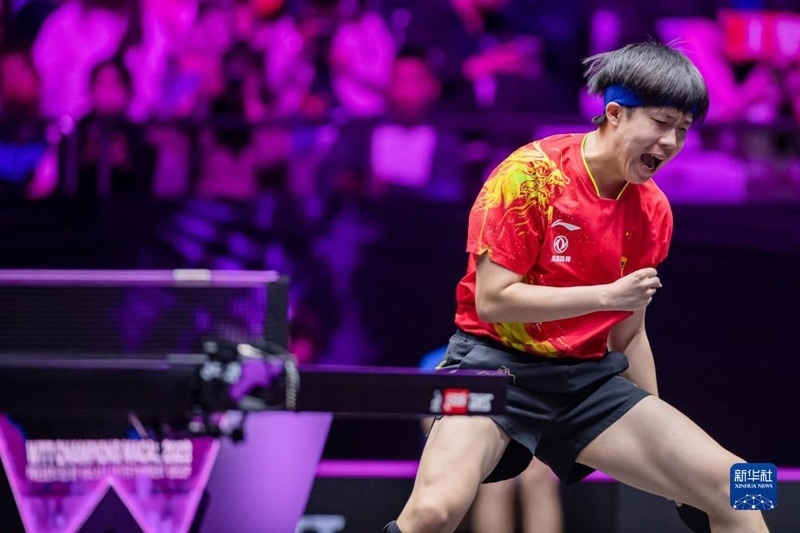 2023年4月23日,王曼昱在比賽中慶祝得分。當(dāng)日,在澳門(mén)塔石體育館舉行的2023世界乒乓球職業(yè)大聯(lián)盟(WTT)澳門(mén)冠軍賽女子單打決賽中,中國(guó)選手王曼昱以4比2戰(zhàn)勝隊(duì)友陳夢(mèng),奪得冠軍。新華社記者 張金加攝