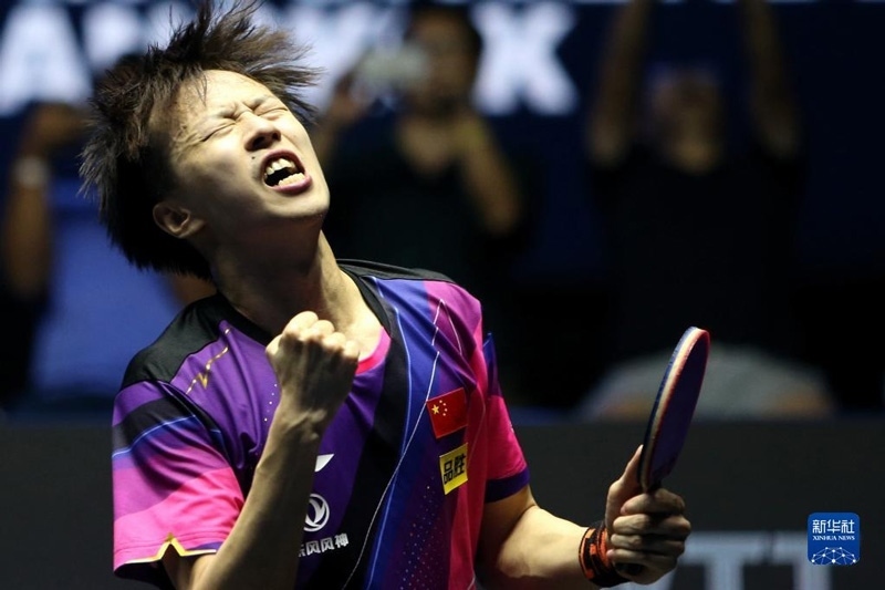 2023年4月23日,中國(guó)選手王楚欽慶祝得分。當(dāng)日,在澳門(mén)塔石體育館舉行的2023世界乒乓球職業(yè)大聯(lián)盟(WTT)澳門(mén)冠軍賽男子單打決賽中,中國(guó)選手王楚欽以4比0戰(zhàn)勝隊(duì)友馬龍,奪得冠軍。新華社記者 張金加攝
