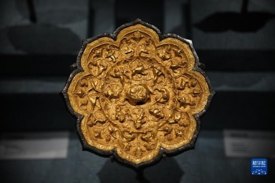 這是在西安博物院《長安有故里——絲路少年大唐行》展覽上展出的金背瑞獸葡萄鏡(5月22日攝)。