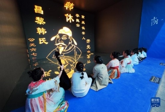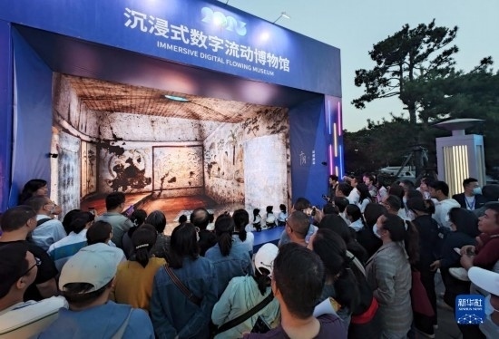 5月22日晚,在2023陜西“博物館與美好生活”文博之夜活動上,游客參觀沉浸式數(shù)字流動博物館。