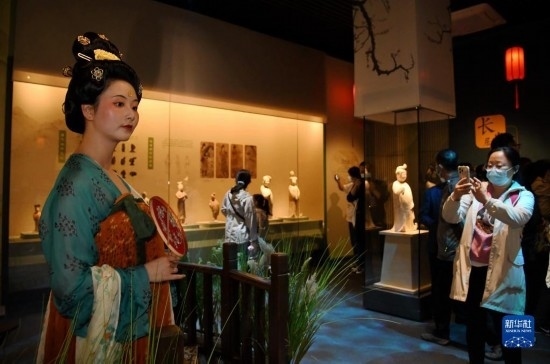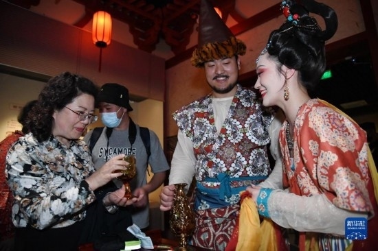 5月22日晚,在西安博物院《長安有故里——絲路少年大唐行》展覽上,身著復原唐裝的演員與游客互動。