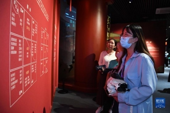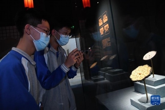 5月22日晚,游客在西安博物院《長安有故里——絲路少年大唐行》展覽上參觀。