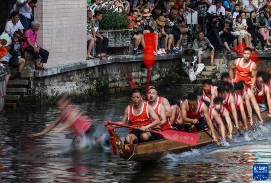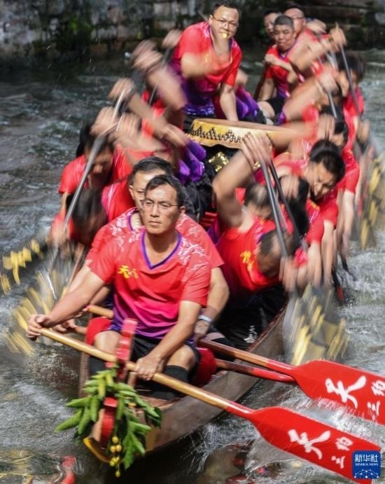 龍船漂移時(shí),船頭船尾的舵手專門(mén)負(fù)責(zé)入彎出彎時(shí)的線路和速度控制(6月22日攝)。