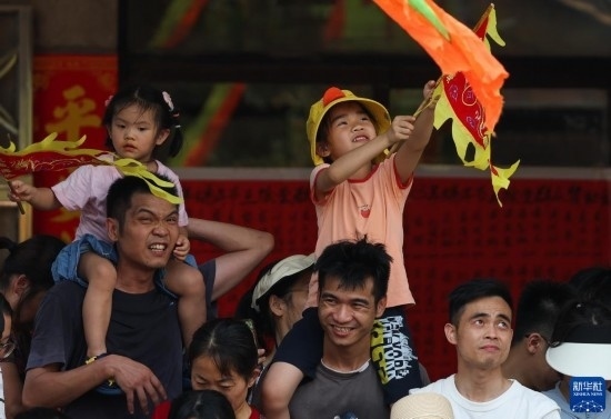 6月22日,佛山疊滘河涌?jī)砂渡踔了系教幨怯^看龍船漂移的觀眾。