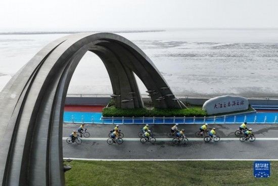 9月17日,騎行愛好者在啟東市江海文化景觀大道騎行(無人機照片)。