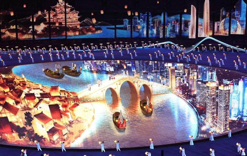 吉祥物“江南憶”破水而出,騰躍而起?!皠?dòng)起來”的“琮琮”“蓮蓮”“宸宸”彈奏起圓形的“水浪鋼琴”,激活了象征著數(shù)字賦能杭州城市建設(shè)的“芯片面板”。660根數(shù)控光源棒點(diǎn)亮“科技之潮”,AR虛擬半球狀的數(shù)字穹頂營(yíng)造出震撼的立體空間。