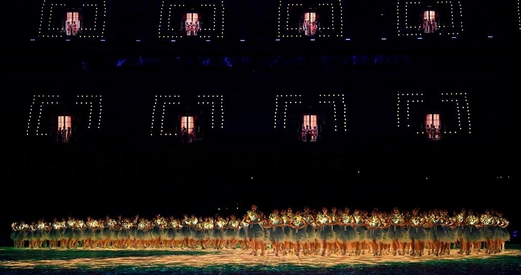 歌聲高潮處,觀眾席中近百扇“幸福之門”同時(shí)開啟。全場(chǎng)萬人合唱,現(xiàn)場(chǎng)每一名觀眾都成為開幕式“主角”,傳達(dá)“亞洲一家攜手同行”的美好愿望。