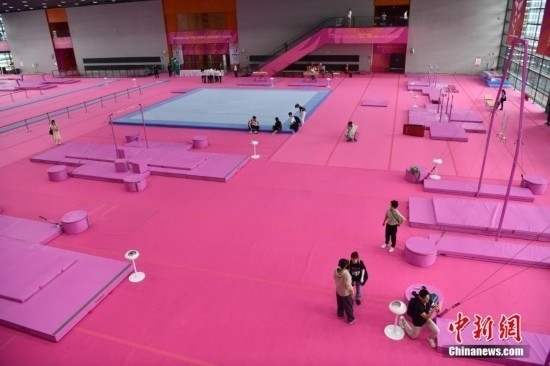 7月14日,成都東安湖體育公園內(nèi),成都大運會體操比賽訓(xùn)練場的粉色布置吸引媒體記者探訪。海綿墊、平衡木、吊環(huán)、鞍馬等設(shè)施均為粉色,充滿青春活力,令人倍感放松。目之所及,海綿墊、平衡木、吊環(huán)、鞍馬等設(shè)施均為粉色。