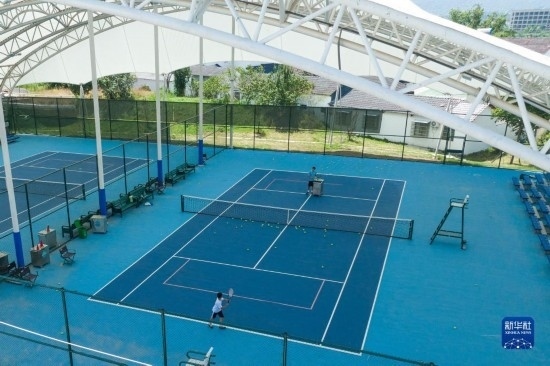 8月9日拍攝的京山文峰網(wǎng)球特色村網(wǎng)球訓(xùn)練場(chǎng)(無(wú)人機(jī)照片)。