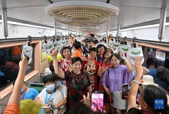 從8月8日起,北京地鐵一號(hào)線開行“時(shí)光列車”,6節(jié)車廂采用不同時(shí)代涂裝風(fēng)格。特別是綠色座椅、車廂頂部風(fēng)扇等元素,帶領(lǐng)乘客瞬間“穿越”,吸引人們紛紛打卡拍照?!皶r(shí)光列車”運(yùn)行時(shí)間是工作日14點(diǎn)至15點(diǎn),運(yùn)行區(qū)間是地鐵古城站至地鐵復(fù)興門站。