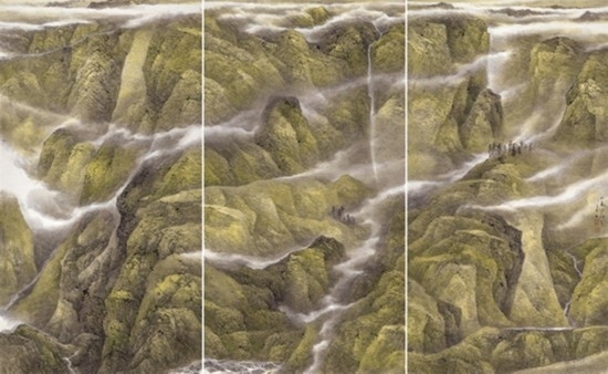 “山河”從來都不單純是自然山水的別稱,更多指代的是“社稷”與“國土”。在革命戰(zhàn)爭年代,“一寸山河一寸血,一抔熱土一抔魂”的詩句,不知激勵了多少仁人志士投身革命,為國捐軀。這個展覽以“山河回聲”為主題,也表明了樂震文、張弛的山水畫并不是傳統(tǒng)意義上臥游逍遙的文人山水,而是以山水建構現代人文精神內涵的國家史詩敘事。