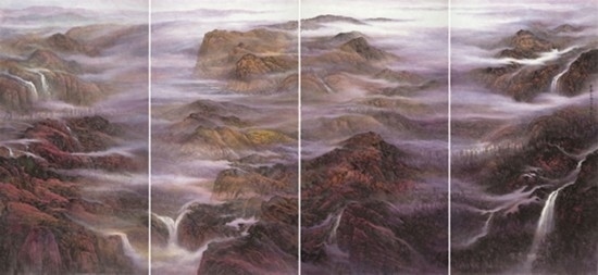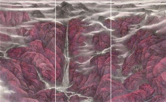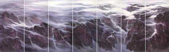 且看樂震文的《直上浮云》《云卷云舒》和《黃土馳風,日月星辰》,那逶迤茫茫的群山峻嶺,那縱橫畫面的云蒸霞蔚,那連綿不絕的箭樓城堞,哪里還是傳統(tǒng)文人山水畫的淡煙輕嵐,縹緲冷逸?濃縮于畫內的精神意蘊,分明凸顯了現代山水畫對家國情懷的抒發(fā)。且讀張弛的《云起疊嶂》《惟余莽莽》和《紫氣氤氳》,那天光紫氣的浩渺煙云,那渾然一體的山水氣象,那千回百轉的流水飛泉,其實早已脫離了對自然山水的寫照,而是她感悟的時代精神在偌大畫面上的縱橫揮寫、主觀臆造。
