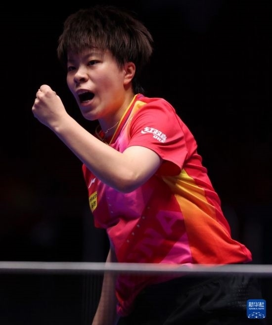 世乒賽|乒乓球——中國(guó)女團(tuán)晉級(jí)決賽 2月23日,王藝迪在第三盤比賽中慶祝得分。她3比0戰(zhàn)勝法......