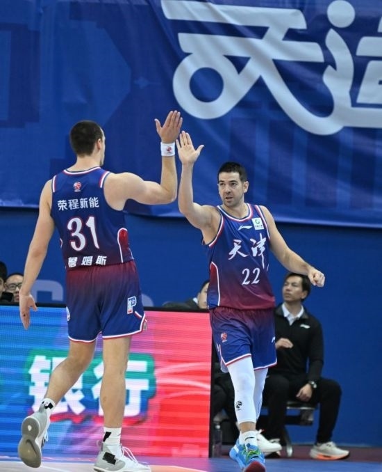 12月2日,天津隊(duì)球員羅切斯特(右)與隊(duì)友詹姆斯慶祝得分。新華社記者 孫凡越 攝