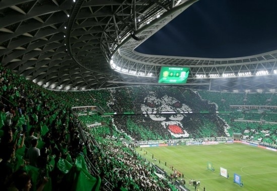 8月19日,球迷在現(xiàn)場(chǎng)擺出北京國(guó)安隊(duì)的雄獅圖案。新華社記者 張晨霖 攝
