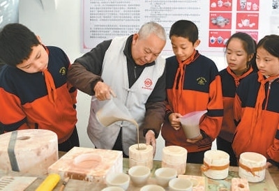 湖北通城的陶瓷非遺傳承人向學生們傳授陶藝制作技藝。劉建平攝(人民視覺)