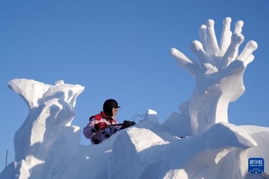 1月7日,選手在哈爾濱太陽島雪博會園區(qū)進行雪雕創(chuàng)作。