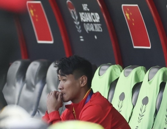 1月13日,中國隊(duì)對(duì)陣塔吉克斯坦隊(duì),圖為因傷未能進(jìn)入名單的韋世豪賽前在替補(bǔ)席上。新華社記者 曹燦 攝