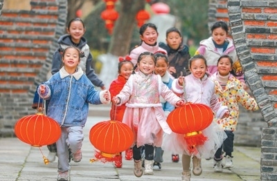 孩子們?cè)谳陡鄞逯信e著燈籠,歡快奔跑。陸志鵬攝(人民視覺)