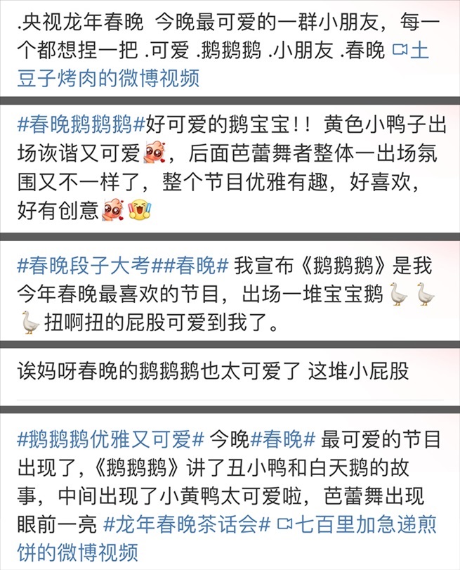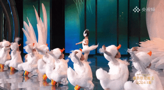 當你提“鵝鵝鵝”,自然要期待“曲項向天歌”。駱賓王、唐詩宋詞、中華文化....看到節(jié)目單上的題目《鵝鵝鵝》,大概很多觀眾都以為是要詠詩。當大幕開啟,柴可夫斯基的《天鵝湖》奏起,氣氛瞬間變得端莊典雅了,可接下來出場的是一群圓滾滾、扭著屁股的小小鵝,這波反差萌,讓網(wǎng)友直呼“創(chuàng)意絕了”。