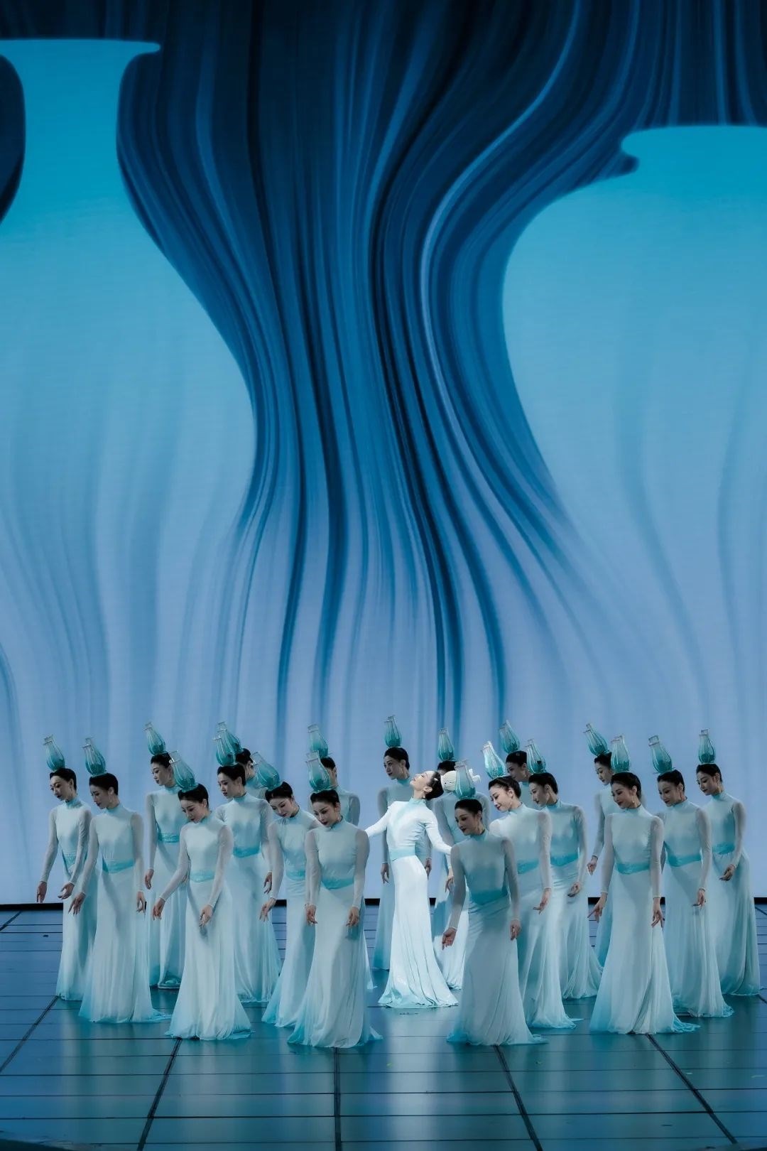 《瓷影》正是以青白瓷為視覺出發(fā)點,演出服裝在色彩上著墨,提取“青”“白”這兩種傳統(tǒng)“正色”,展現(xiàn)出大繁若簡的東方美學。通過舞者的肢體語言展現(xiàn)青白瓷跨越千年的獨特魅力。