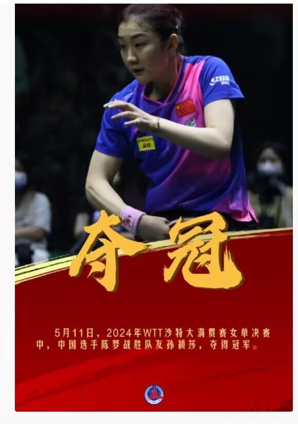 今天,在2024年WTT沙特大滿貫賽女單決賽中,中國(guó)選手陳夢(mèng)戰(zhàn)勝隊(duì)友孫穎莎 ,奪得冠軍。祝賀陳夢(mèng),孫穎莎辛苦了!拼過(guò)就是勝利,繼續(xù)加油?。ㄓ浾撸和鹾V蓿?/p>