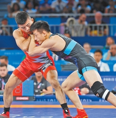 當(dāng)?shù)貢r間8月6日,中國隊選手曹利國(右)在巴黎奧運會男子古典式摔跤60公斤級決賽中。環(huán)球時報記者 李 昊攝