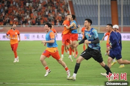 山東泰山隊(duì)點(diǎn)球大戰(zhàn)取勝,隊(duì)員沖進(jìn)場(chǎng)內(nèi)慶祝。中新社發(fā) 陳陽 攝