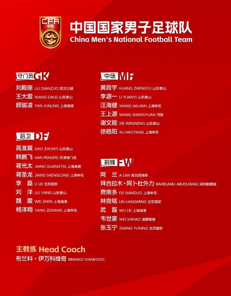 以下為24人大名單:武磊、顏駿凌、蔣光太、魏震(上海海港),王大雷、劉洋、高準翼、黃政宇、謝文能、李源一(山東泰山),韋世豪(成都蓉城),費南多、蔣圣龍、徐皓陽、楊澤翔、汪海?。ㄉ虾I昊ǎ罾?、張玉寧、林良銘(北京國安),劉殿座(武漢三鎮(zhèn)),韓鵬飛(天津津門虎),王上源(河南),拜合拉木·阿卜杜外力(深圳新鵬城),阿蘭(青島西海岸)。